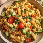 - Combine Everything: In a large bowl, mix cooled pasta, chickpeas, and chopped vegetables; then toss with the dressing.