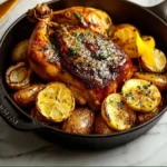 5. Prepare the Roasting Pan: Drizzle olive oil in a roasting pan and place the chicken inside. Surround it with any remaining shallots, lemons, and garlic that didn’t fit inside the cavity.